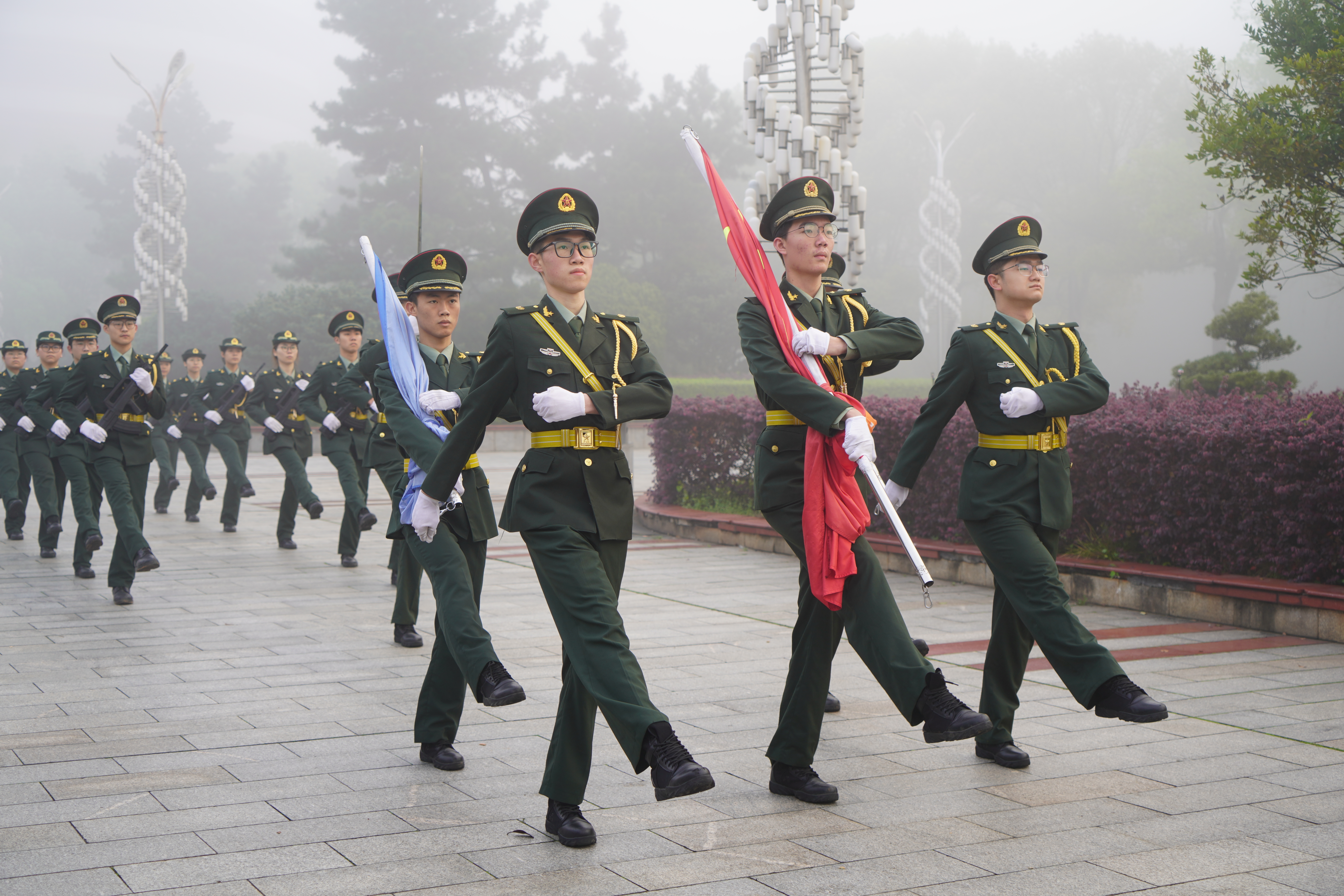 清晨,庄严的升国旗仪式在朦胧雾气中正式启幕。国旗护卫队队员们迈着铿锵步伐,护卫五星红旗走向升旗台。随着“升国旗,奏唱国歌”的洪亮口令响起,全体师生肃立端正、高唱国歌,共同注视五星红旗缓缓升起。