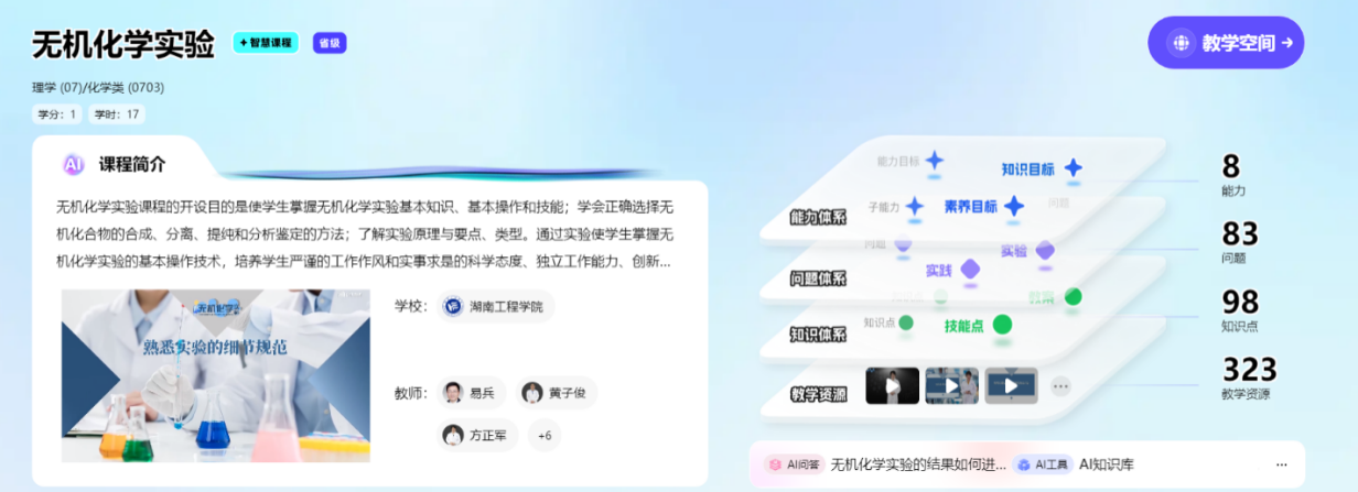 《无机化学实验》课程团队精准聚焦传统实验教学中知识体系离散、资源整合不足、个性化支持乏力等痛点,创新性提出“知识图谱+AI”融合模型,构建了“概念—操作—资源”三元组知识图谱,将实验原理、操作规范、安全要点等核心内容结构化关联,打破了传统知识碎片化呈现方式。课程依托智能教学平台,实现两大突破:一是为学生规划个性化学习路径,二是提供实时精准的学习支持与智能评价,形成“教学—学习—评价”闭环。该模式显著提升了学生对实验知识的整合效率与理解深度,有效激发了探究热情与创新能力,为化学实验教学的数字化转型提供了可复制、可推广的新范式。